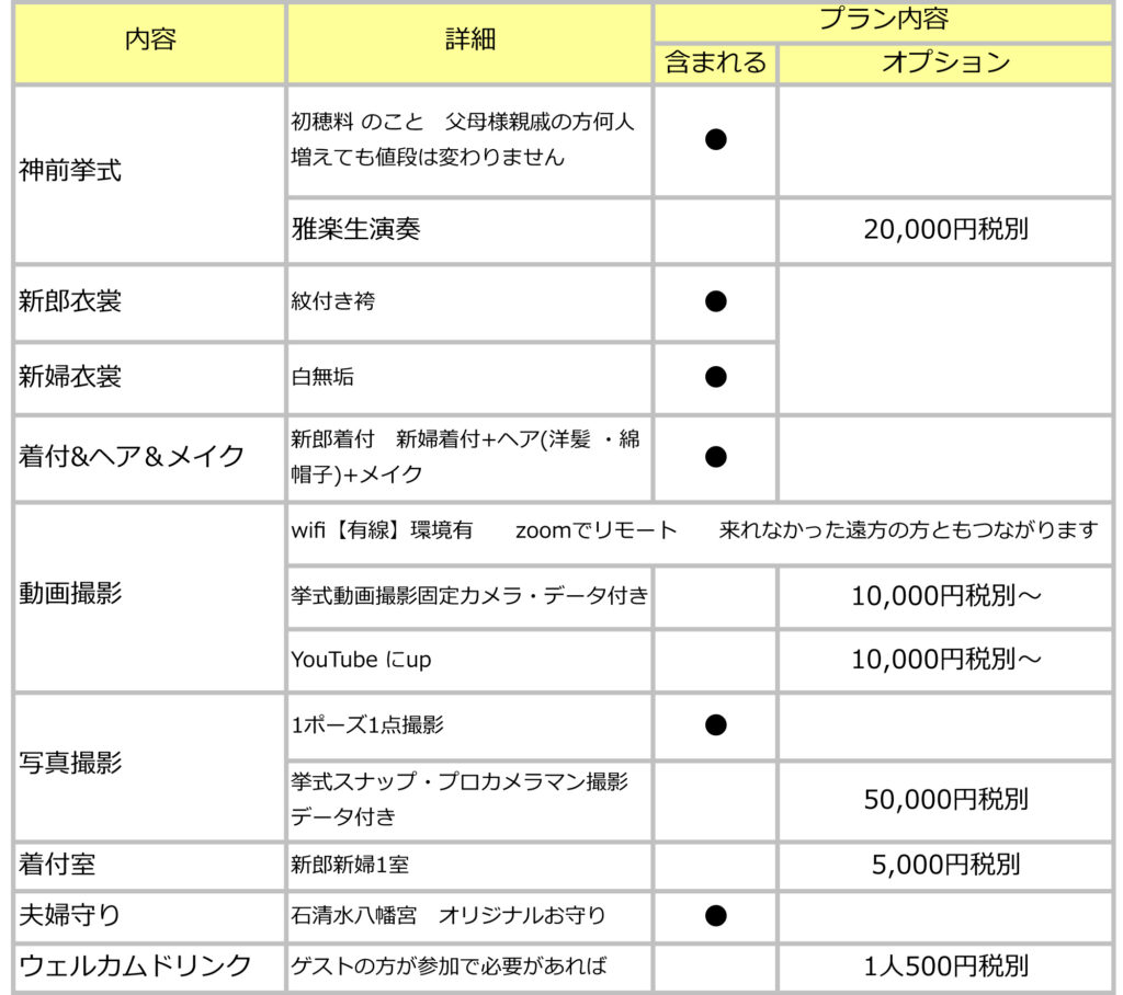 | 神前挙式 | 初穂料 父母様親戚の方何人増えても値段は変わりません | ⭕️ | |